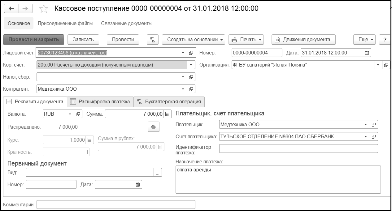 Сформируем документ Кассовое поступление, которым отразим поступление денежных средств от ООО "Медтехника".