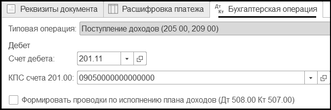 Закладка Бухгалтерская операция указывается типовая операция Поступление доходов (205 00, 209 00):
