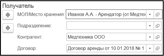 Для отражения данной информации в разделе 4 Инвентарной карточки (ф. 0504031) в документе Передача объектов ОС, НМА, НПА на закладке Общие сведения, в разделе Получатель в реквизите МОЛ/Место хранения необходимо выбрать руководителя или ответственное лицо арендатора.