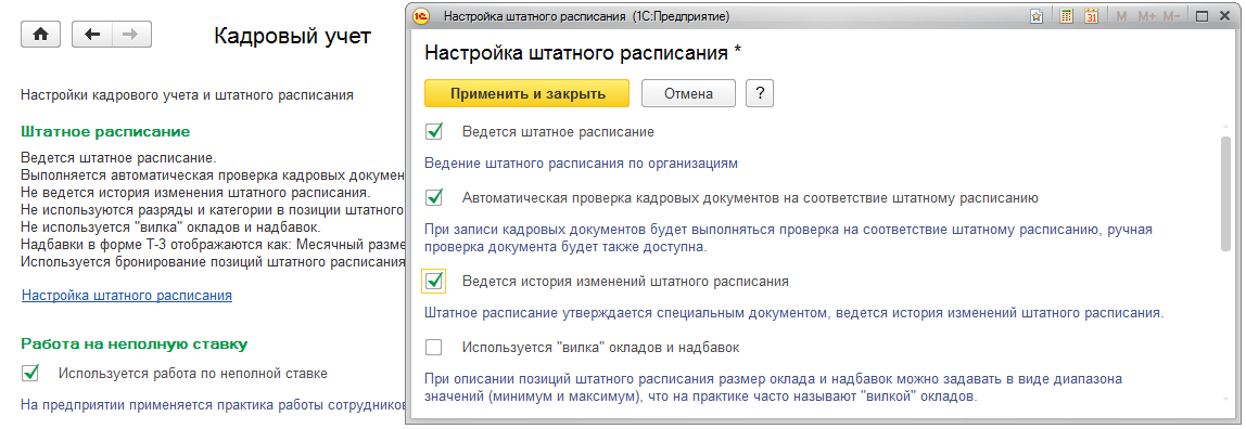 В настройках Кадрового учета включим переключатель "Ведется история изменений штатного расписания"