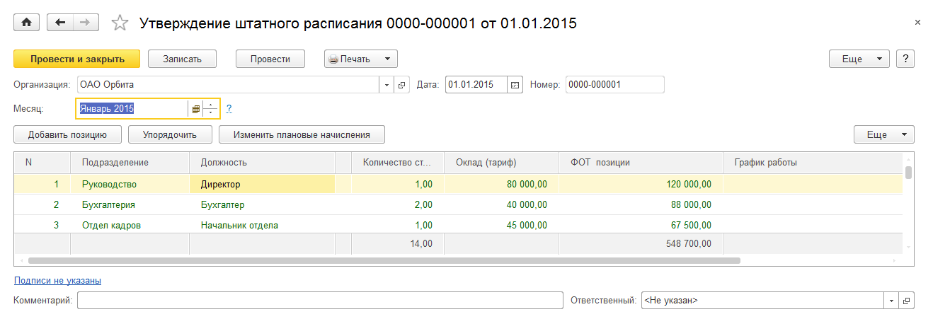 Для ОАО Орбита необходимо зарегистрировать в программе следующее штатное расписание: