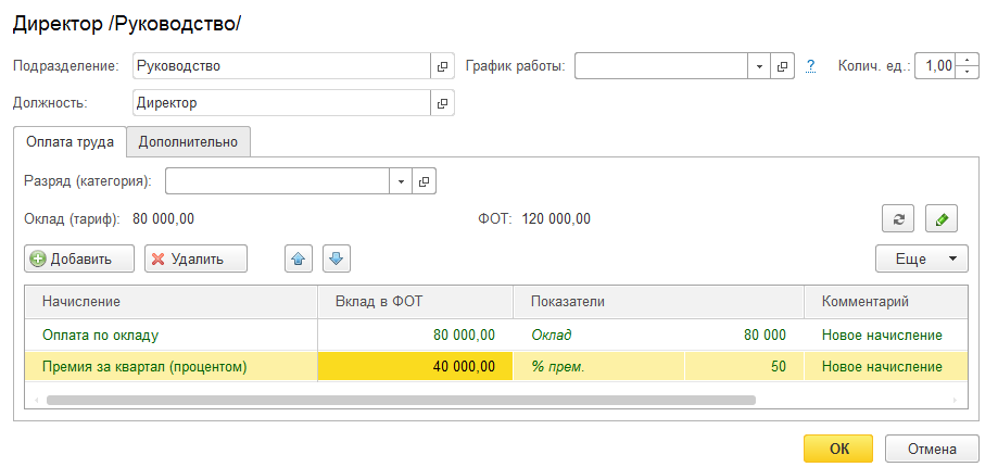 Для позиции Директор установим Оплату по окладу и Премию за квартал. Т.к. квартальная премия имеет сложную формулу расчета, вручную откорректируем "Вклад в ФОТ".