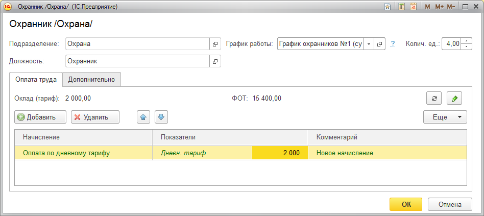 Для позиции Охранник установим Оплату по дневному тарифу и заполним График работы. В данном случае график необходим для расчета ФОТ позиции штатного расписания.