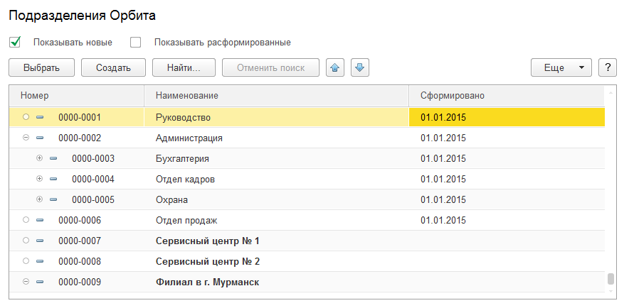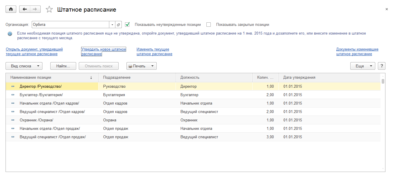 После утверждения позиций штатного расписания, в справочнике должностей автоматически заполняется дата формирования подразделения.