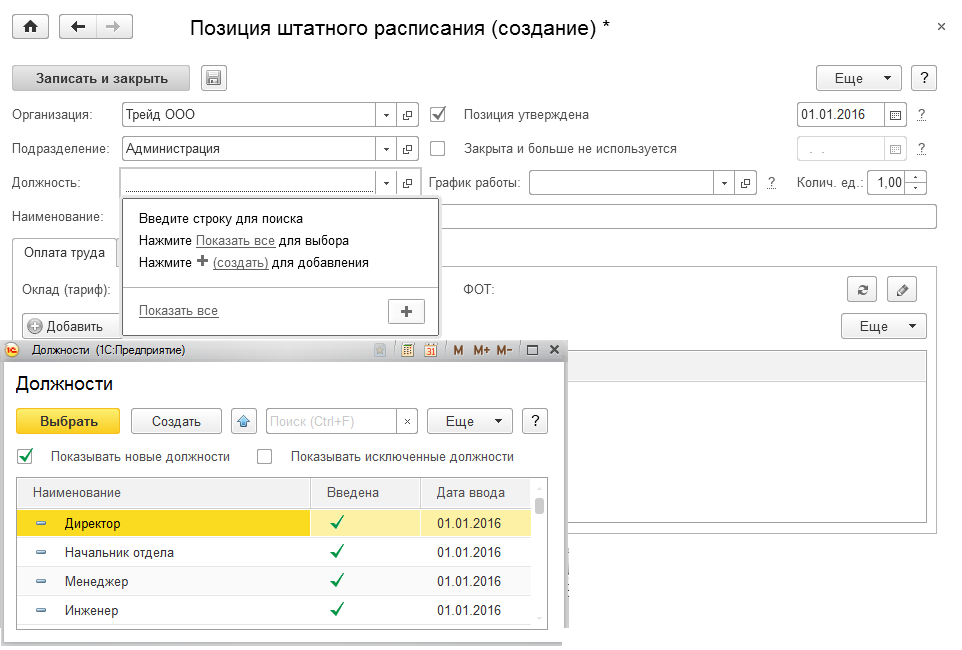 - новые позиции добавляются непосредственно в справочник "Штатное расписание" по актуальным подразделениям и должностям;