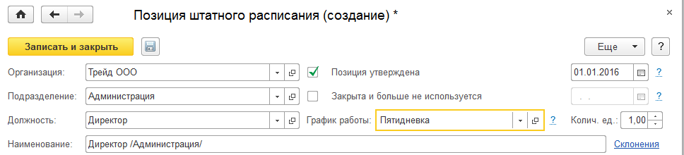 Далее указываем график работы "Пятидневка", дата утверждения позиции – 01.01.2016, и количество ставок – 1.