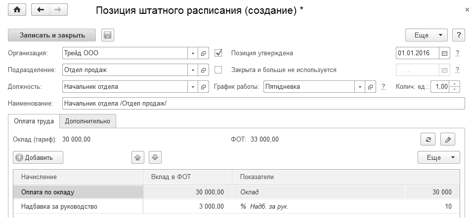 При добавлении новой позиции штатного расписания указывается: