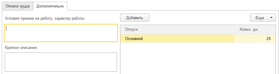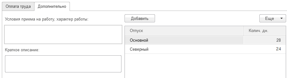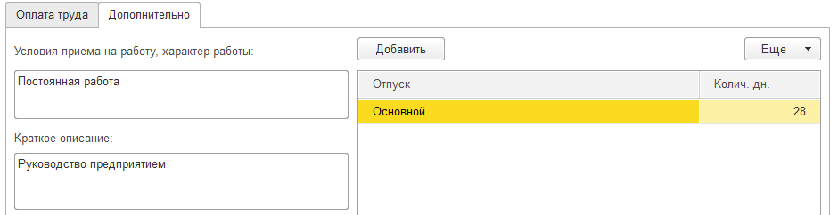 Заполним закладку "Дополнительно": условия приема на работу – Постоянная работа, описание – Руководство предприятием, право на основной отпуск 28 дней.