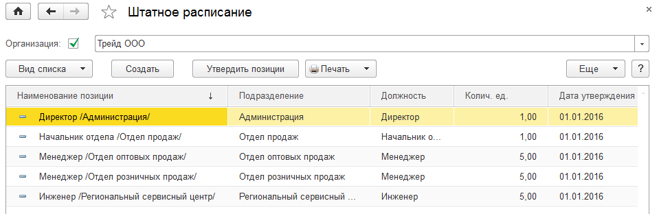 Откроем в разделе "Кадры" справочник "Штатное расписание". Установим отбор по ООО "Трейд" (как это делали при вводе подразделений) и введем несколько позиций на 01.01.2016: