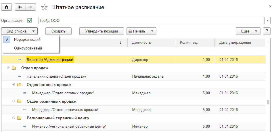 Кроме того, список штатных единиц может быть одноуровневым либо многоуровневым, пользователь может указать данную настройку самостоятельно, в зависимости от того, какое отображение ему более удобно.
