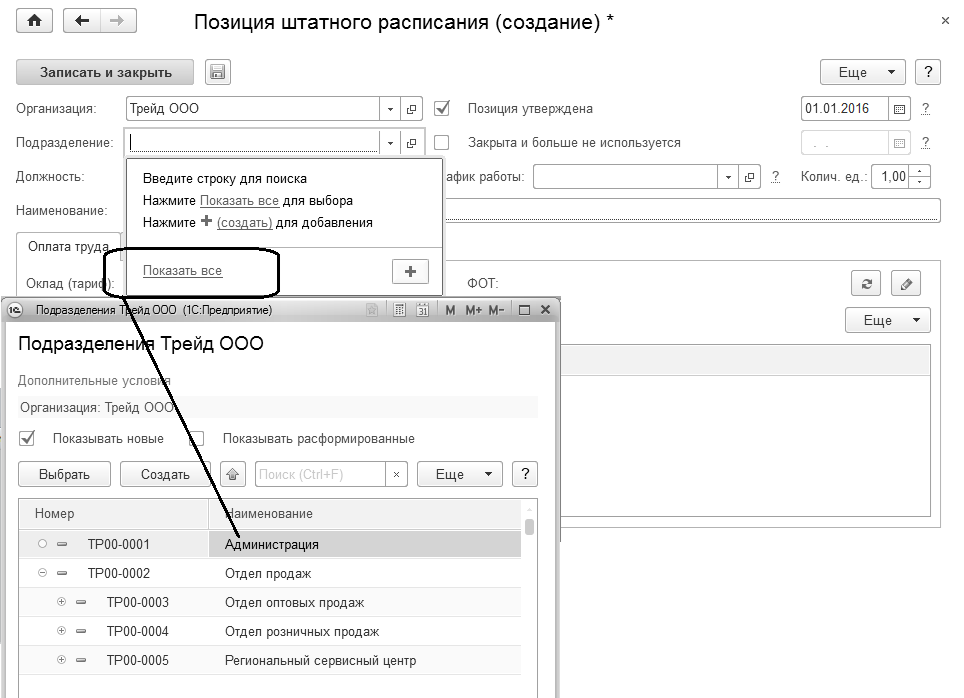 По команде "Создать" добавляем новую позицию. Подразделение выбираем из справочника "Подразделения" (при этом название можно набрать с клавиатуры либо воспользоваться ссылкой "Показать все").