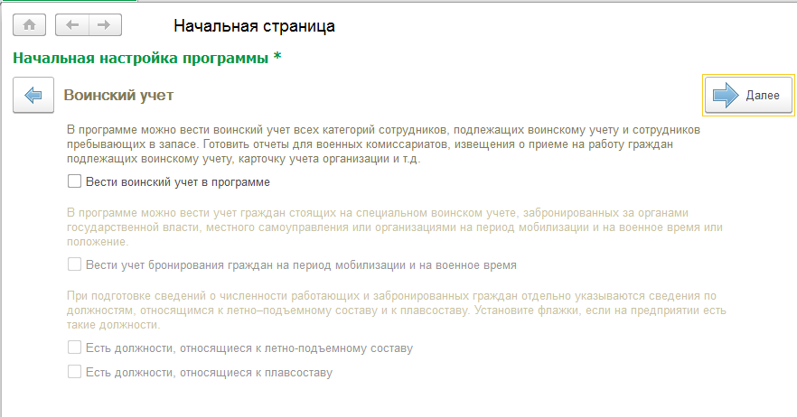 Настройки выполняются в том случае, если в информационной базе ведется воинский учет с составлением отчетности для военных комиссариатов. Настройки этого шага соответствуют настройке из раздела "Настройка / Кадровый учет".