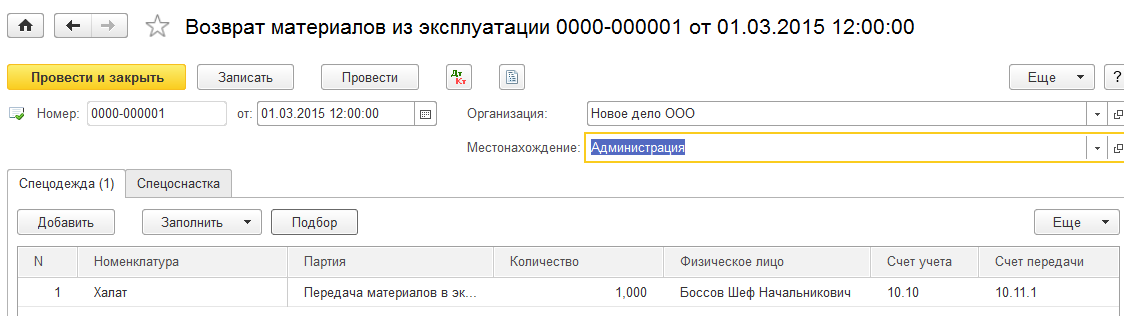 Практикум № 44 01 марта отразить возврат халата директора из эксплуатации на склад.