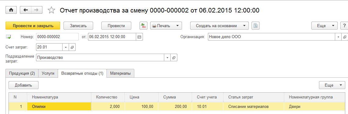 Для отражения в учете операций возврата из производства отходов в документе «Отчет производства за смену» предусмотрена соответствующая табличная часть, отдельная закладка «Возвратные отходы». Отдельная таблица позволяет указать номенклатуру, количество и учетную стоимость возвратных отходов, что необходимо для того, чтобы при расчете фактической себестоимости выпускаемой продукции сумму отходов вычесть из суммы материальных расходов и фактически уменьшить дебетовый оборот по счету 20. Кроме того, обособленное указание возвратных отходов исключает их из перечня номенклатуры, по которой в конце месяца идет пересчет фактической себестоимости.