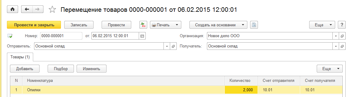 1. Сформируйте документ «Перемещение товаров» – оприходование возвратных отходов (опилки) на счет 10.06