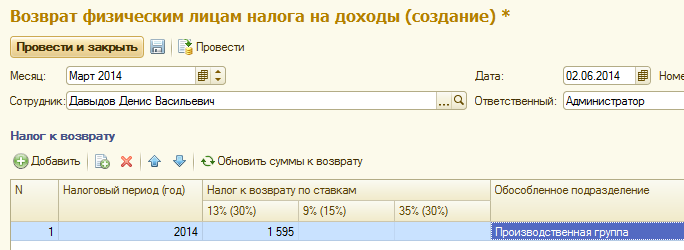 Документ "Возврат НДФЛ" доступен в разделе "Налоги и взносы". Документ создается на одного сотрудника, сумму возврата можно заполнить вручную либо по команде "Обновить суммы к возврату".
