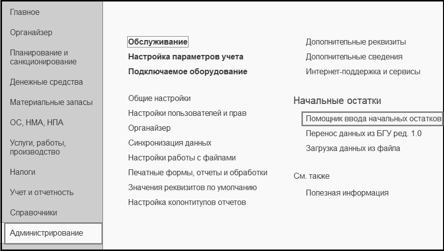 Помощник ввода начальных остатков" меню функций раздела "
