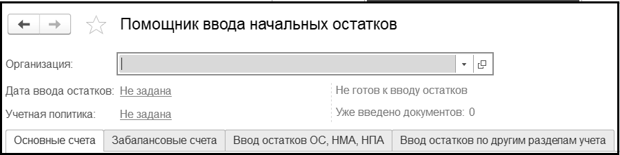 Отметим, что до ввода остатков, требуется выбрать организацию, для которой необходимо вводить остатки, указать для нее параметры учетной политики и выбрать дату ввода остатков.