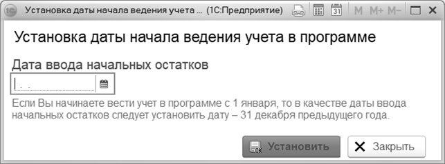 В открывшемся окне указывается дата ввода начальных остатков. Для сохранения даты и закрытия окна нажать кнопку "