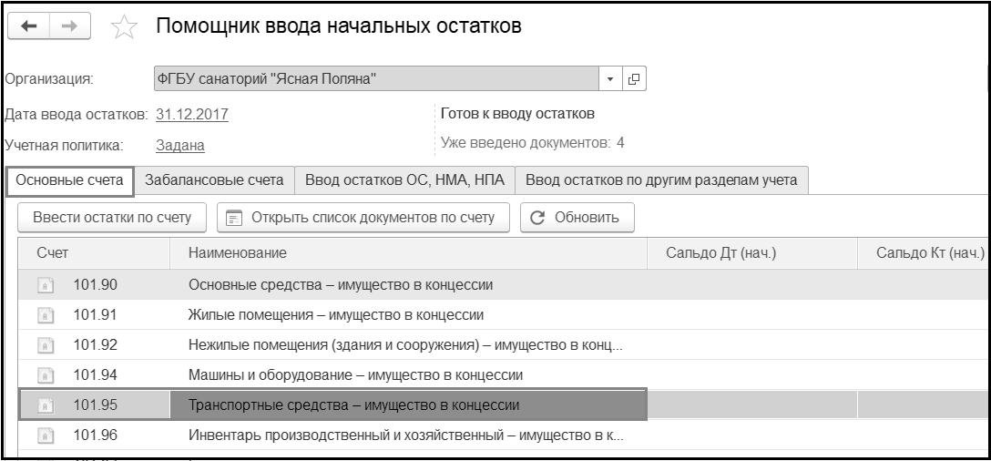 Для ввода начальных остатков следует выбрать счет, остатки по которому следует ввести, в таблице "