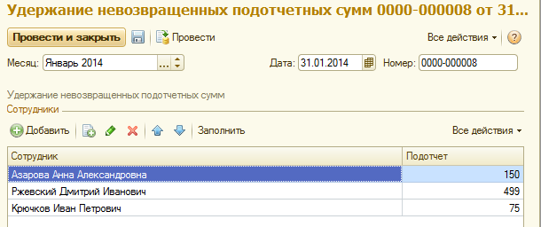 - "Удержание невозвращенных подотчетных сумм" - ввод данных для удержания невозвращенных подотчетных сумм из заработной платы: Азарова А.А. – 150 руб., Ржевский Д.И. – 499 руб., Крючков И.П. – 75 руб.