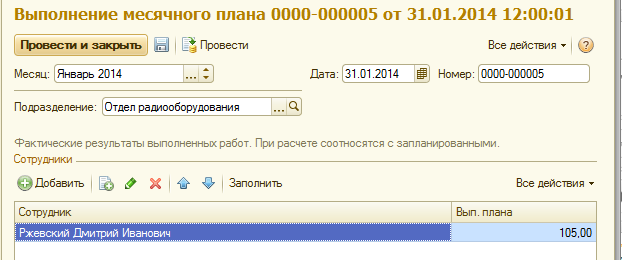 Зададим значения разовых показателей для созданных в программе начислений с помощью разных видов документа "Данные для расчета зарплаты":- "Выполнение плана" – указывается за январь 2014г. для расчета доплаты за выполнение плана: Отдел радиооборудования, Ржевский Д.И. 105 единиц;