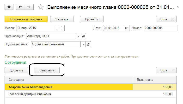 - "Выполнение плана" – указывается для ООО «Авангард» за январь 2015г. для расчета доплаты за выполнение плана: Отдел радиооборудования, Ржевский Д.И. 155 единиц, Азарова А.А. 160 единиц;