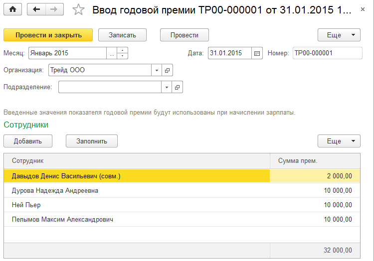 - "Ввод годовой премии"- указывается для ООО «Трейд» размер годовой премии за январь 2015. для регистрации премии всем сотрудникам, как на рисунке ниже