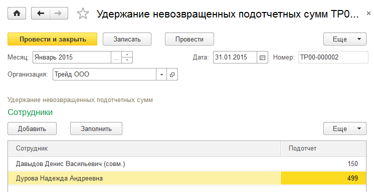 - "Удержание невозвращенных подотчетных сумм" - ввод данных для удержания невозвращенных подотчетных сумм из заработной платы сотрудников ООО «Трейд»: