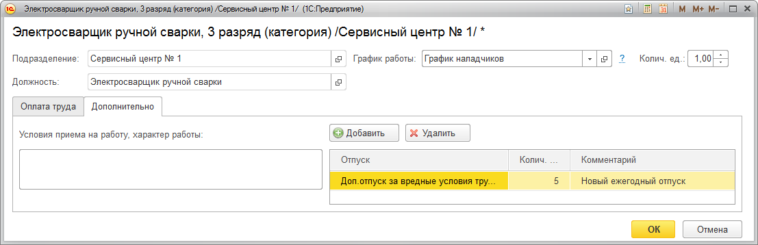 Создадим новыйдокумент Изменение штатного расписания и для позиции Электросварщик ручной сварки на закладке Дополнительно установим право на доп.отпуск