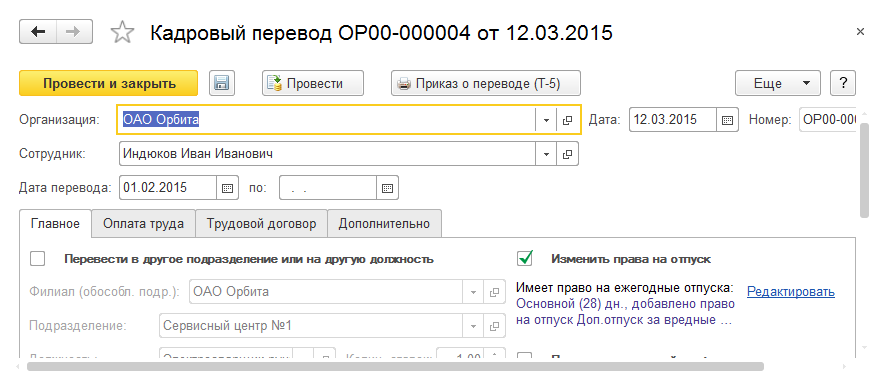 Оформим "Кадровый перевод" сотрудника Индюкова И.И.