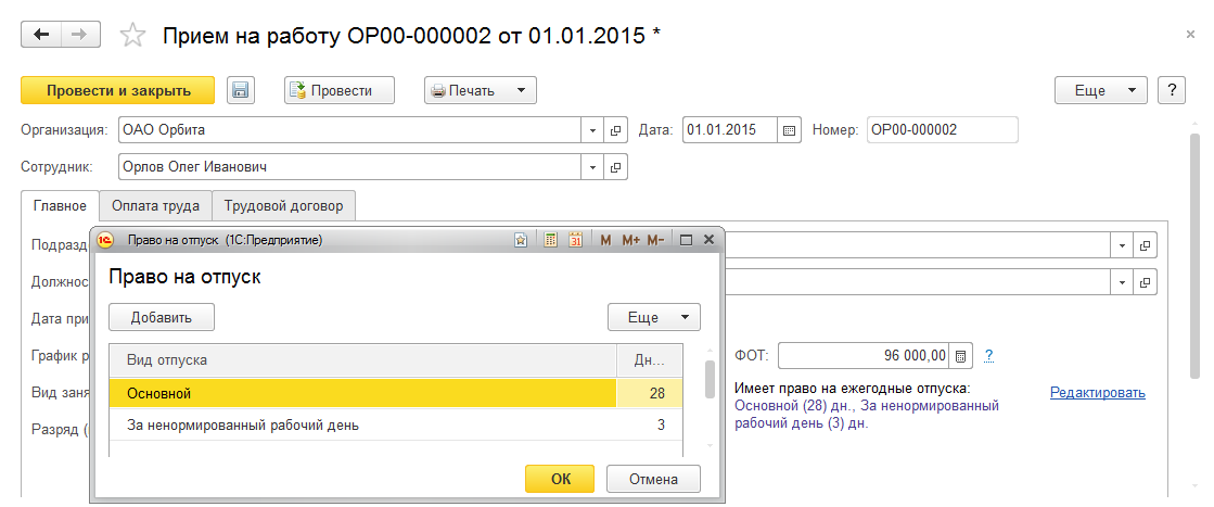 Откорректируем данные в документе "Прием на работу"