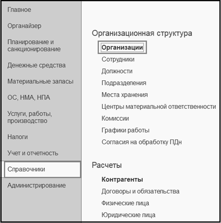 Программа БГУ позволяет вести учет нескольких организаций в общей информационной базе. Список организаций можно открыть с помощью команды Организации раздела Справочники.