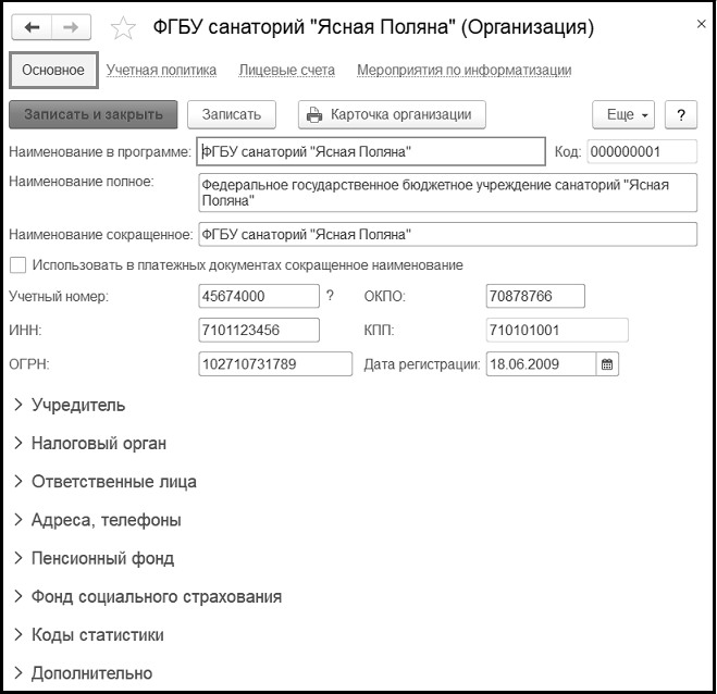 Информация об организации сгруппирована в нескольких формах, расположенных в верхней части формы элемента справочника Организации (карточки организации). Для ведения учета и печати документов необходимо заполнить реквизиты организации.