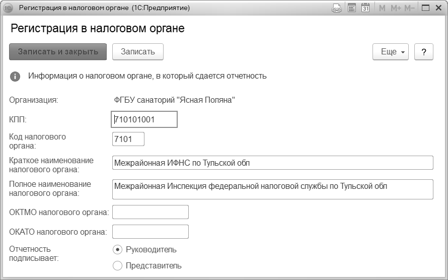 В форме сведений о налоговом органе указываются: Код налогового органа, Краткое наименование налогового органа – наименование, отображаемое в списках и полях формы, Полное наименование налогового органа, ОКТМО (Общероссийский Классификатор Территорий Муниципальных Образований) налогового органа, ОКАТО (Общероссийский классификатор административно-территориального деления) налогового органа. Также указывается информация о том, кем подписывается отчетность - Руководителем или Представителем. Если отчетность сдается представителем, то требуется заполнить данные доверенности и представителя.