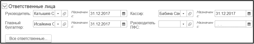 Указывается информация об ответственных лицах учреждения, в том числе о датах назначения их на должности. Ответственные лица учреждения - это те, расшифровка подписей которых используется в печатных формах документов.