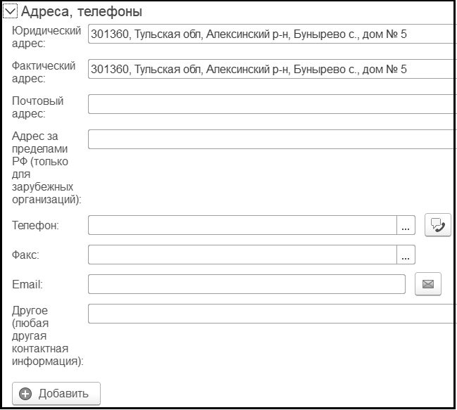 Группа реквизитов Адреса, телефоны (указывается контактная информация организации):
