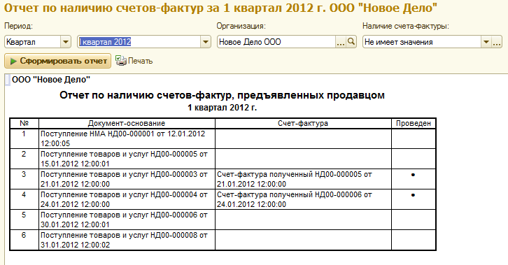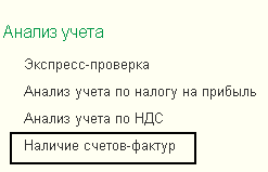 2. Проконтролировать полноту ввода счетов-фактур посредством отчета «Отчет по наличию счетов-фактур».