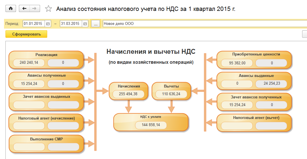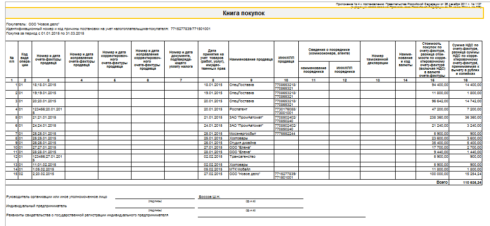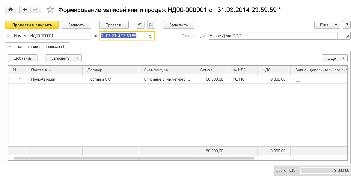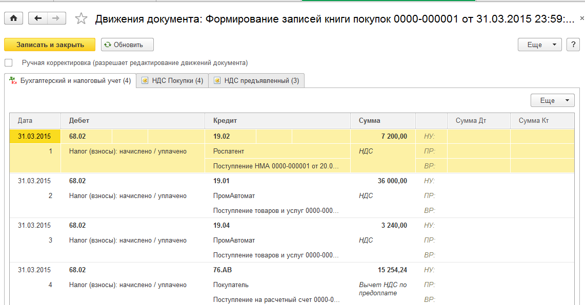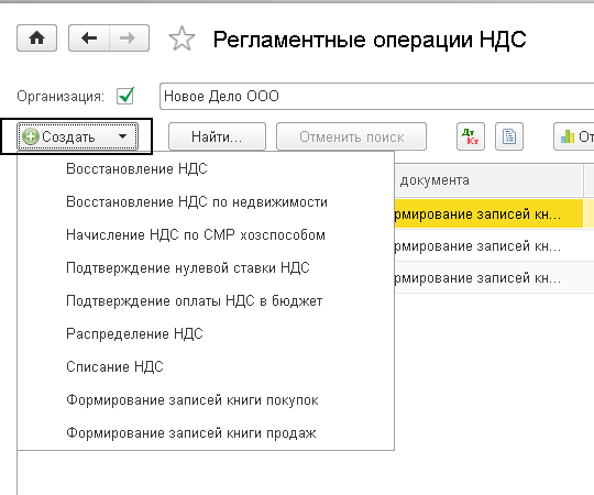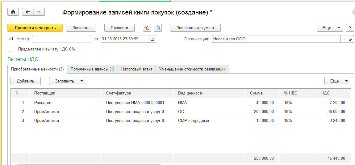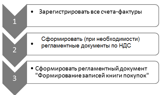 Итоговым регламентным документом по учету НДС будет «Формирование записей книги покупок», который заполняется полностью автоматически всеми до сих пор не принятыми к вычету суммами НДС.