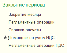 Для удобства формирования всех регламентных документов по НДС предназначена обработка «Помощник по учету НДС»