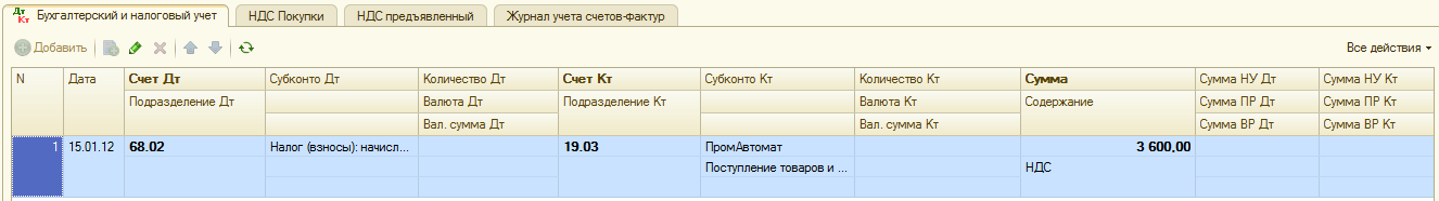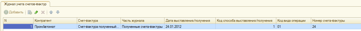 При регистрации в системе счетов-фактур полученных программа автоматически формирует как записи по регистру бухгалтерии (журнале проводок), так и по внутренним регистрам накопления.