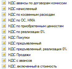 Для максимальной автоматизации учета НДС и своевременного принятия к учету НДС реализовать данную схему только по счету 19 не представилось возможным. Ввиду этой ситуации всю подсистему учета НДС вынесли на отдельные регистры – регистры накопления, список которых приведен ниже.