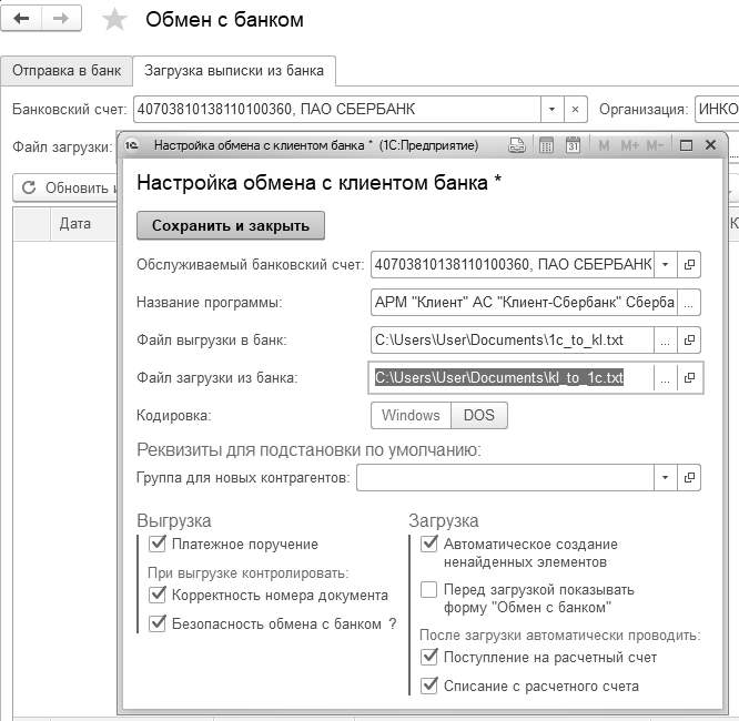 Открыть форму "Обмен с банком" можно из банковской выписки по кнопке "Еще/Обмен с банком". В форме "Обмен с банком" по кнопке "Настройка" открывается форма, в которой выбираются настройки загрузки и выгрузки (рис. 8.6.2).