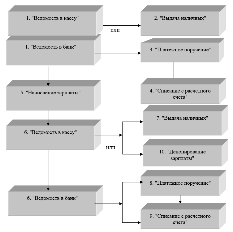 Последовательность документов в программе должна быть следующая, если зарплата перечисляется в банк: