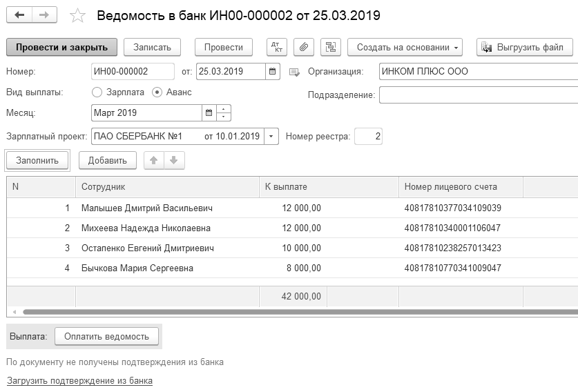Шаг 1. 25.03.2019 года выдайте аванс (зарплата за 1-ю часть месяца) за март сотрудникам ООО "ИНКОМ ПЛЮС". Сумма документа "Ведомость в банк" составила 42 000 руб.