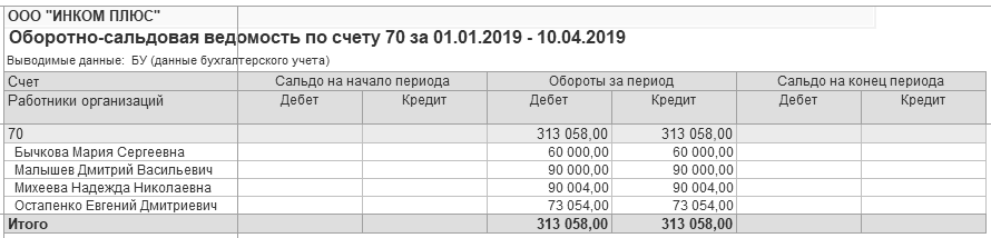 Шаг 8. Для проверки расчетов сформируйте отчет "Оборотно-сальдовая ведомость по счету" 70 за период с 01.01-10.04.2019 года. Остатка на 11.04.2019 года по счету 70 быть не должно (рис. 9.3.3).