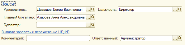 В документах указываются ответственные лица (руководитель и главный бухгалтер) – по ссылке "Подписи".