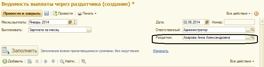Ведомость через раздатчика заполняется по аналогии с кассовой ведомостью, только раздатчик, в отличие от кассы указывается обязательно.