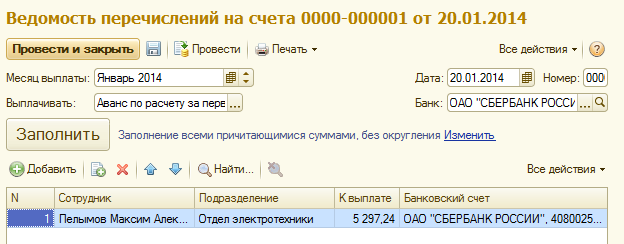 Создадим ведомость перечислений на лицевые счета: укажем дату документа 20.01.2014, выплата за январь, аванс по расчету за первую половину по Сбербанку.