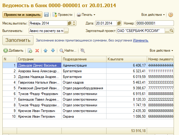 Заполним документ автоматически списком сотрудников, которые получают суммы в этом банке.